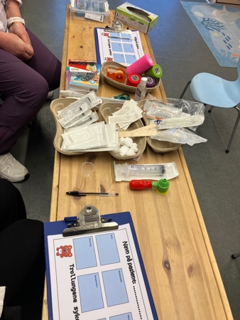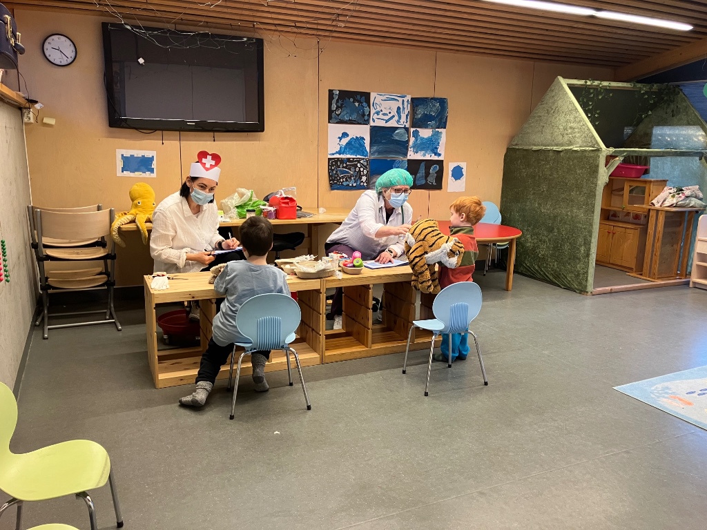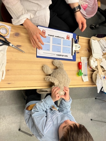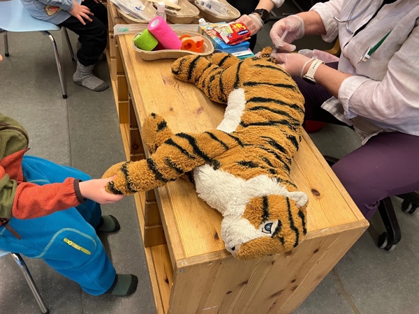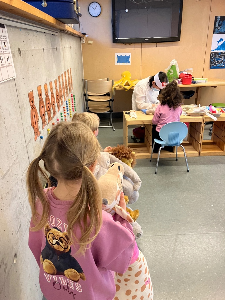 Her har en storbarnsavdeling laget til bamsesykehus 🏥 Barna hadde med seg både bamser, dinosaurer og dukker med skader som måtte fikses. Barna satte seg tålmodig på venterommet før de ble ropt opp, alle skader ble journalført og grundig sjekket før bamsene enten måtte operere, inn til MR eller bandasjere skadene sine. Barna fortsatte leken etter legebesøket med stor omsorg for pasientene sine 🧸
