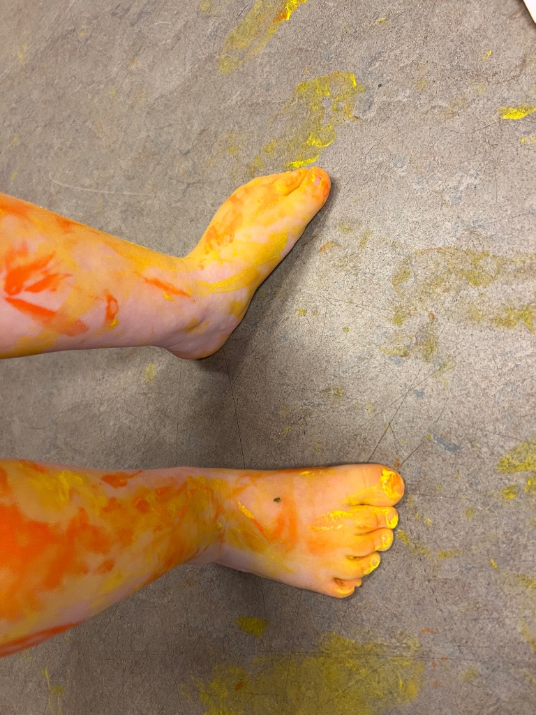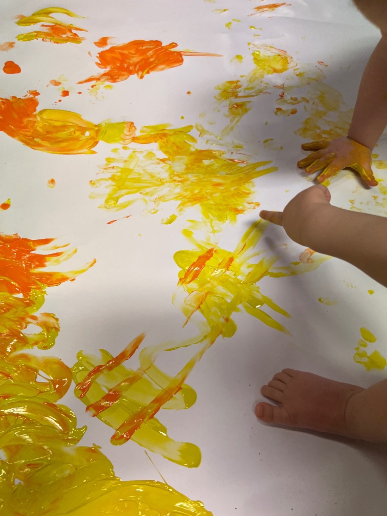 I bare bleiene har de minste fått male med hele seg på et stort ark på gulvet. Barn er kroppslige og nysgjerrige vesen. Her får barna mulighet til å sanse, oppleve, leke, og skape med kroppen som utgangspunkt. Etterpå fant vi fram badebaljer og vaskekluter. Dette ble en minst like kjekk opplevelse hvor barna fikk bade og plaske i vannet og se hvordan vannet endret seg til gult og oransje.